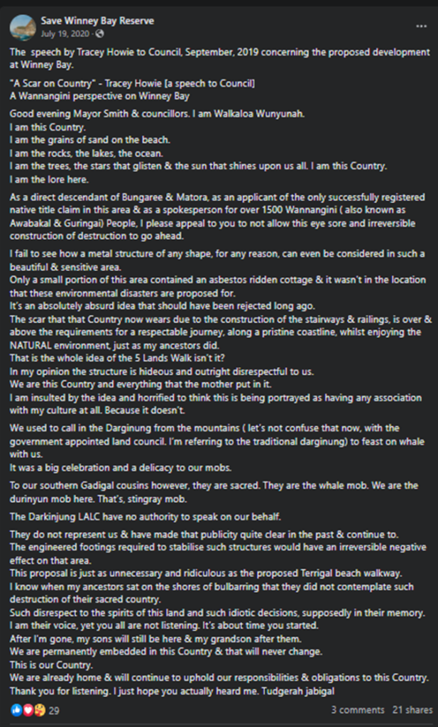 The speech titled A Scar on Country, delivered under the name “Walkaloa Wunyunah” at a Central Coast Council meeting, is presented as a spiritually grounded and culturally legitimate opposition to proposed development at Winney Bay, New South Wales. Its tone and language attempt to situate the speaker as a Traditional Custodian of so-called “Guringai Country,” articulating a narrative of Aboriginal law, kinship, and belonging. However, a comprehensive critical appraisal reveals that the speech is not a product of Aboriginal cultural authority but rather a performance authored by a non-Aboriginal individual, Tracey Howie, whose long record of identity appropriation and misrepresentation is well documented (Cooke, 2025a; 2025b).