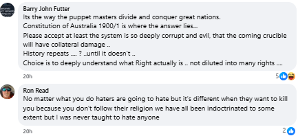 His “love not hate” line fits with a pattern seen in New Age and conspiracy circles where political conflict is reframed as a spiritual problem. This makes organised racism look like just another symptom of “division,” and not a force that must be confronted.